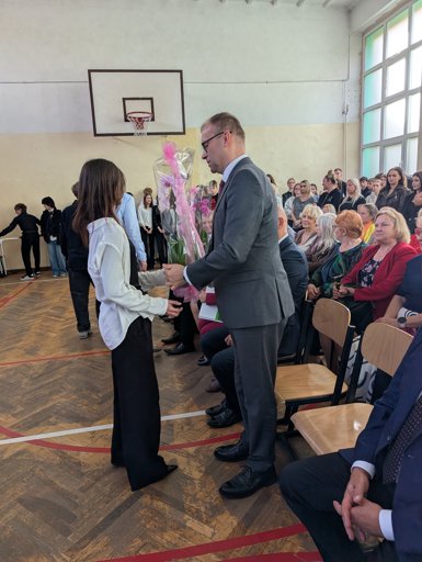 Po części oficjalnej nadszedł czas na podziękowania od uczniów – Dyrekcja otrzymała piękne bukiety kwiatów, a nasi Nauczyciele zostali obdarowani zabawnymi receptami, które z pewnością wywołały uśmiech na ich twarzach!